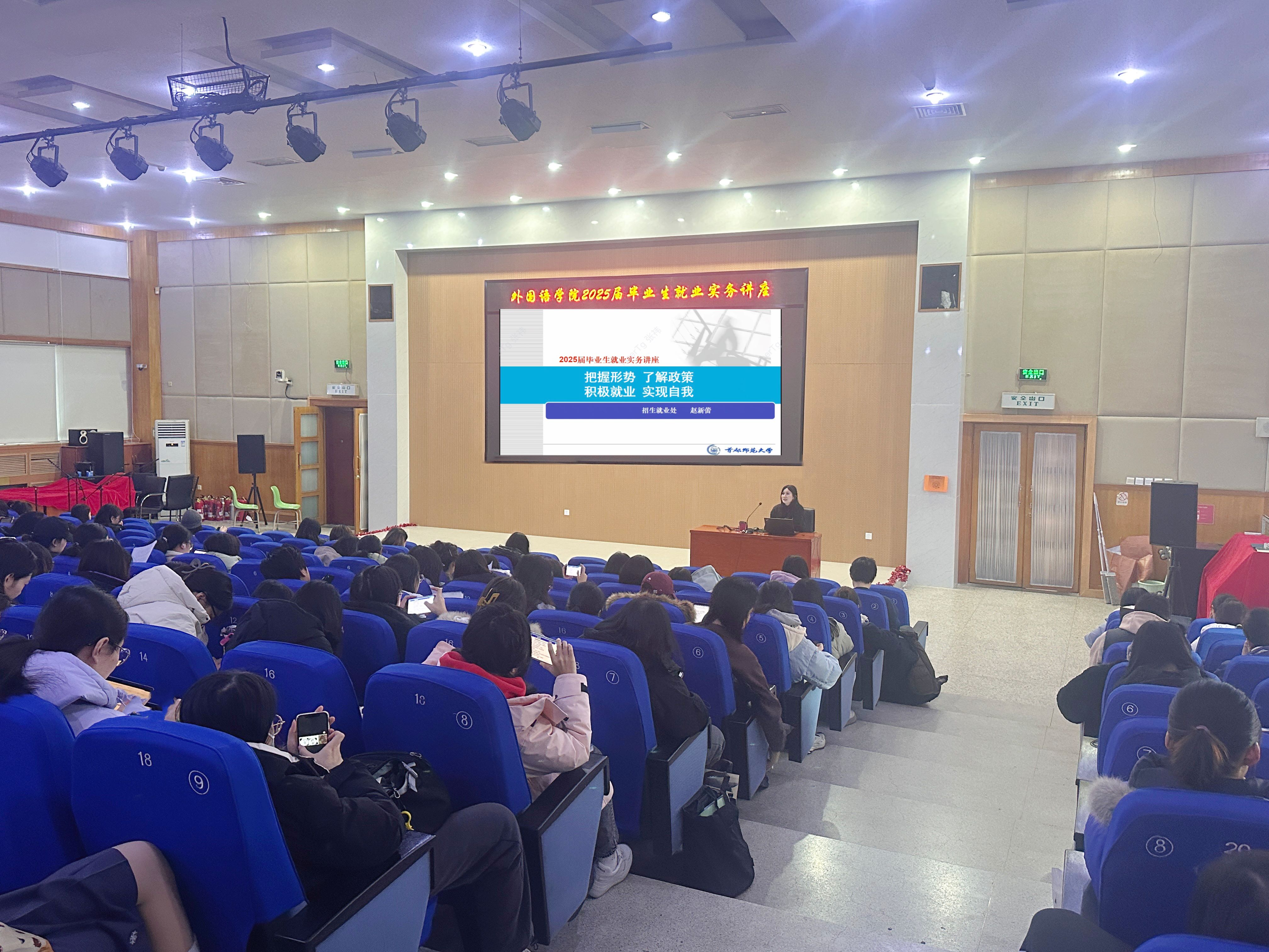 为助力2025届毕业生更好地了解当前就业市场和就业环境,提高就业竞争力,yl23411永利于12月18日下午在外语楼二层学术报告厅举行就业实务讲座,由人才招聘处赵新蕾主讲,本研2025届毕业生近300人参加,现场座无虚席,讲座由研究生辅导员张祎主持。